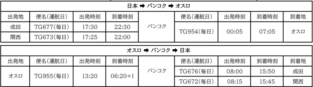 タイ国際航空でオスロへ行く場合は、成田および関空発が便利です。往復ともバンコクでスムーズな乗り継ぎが可能、毎日運航しております。