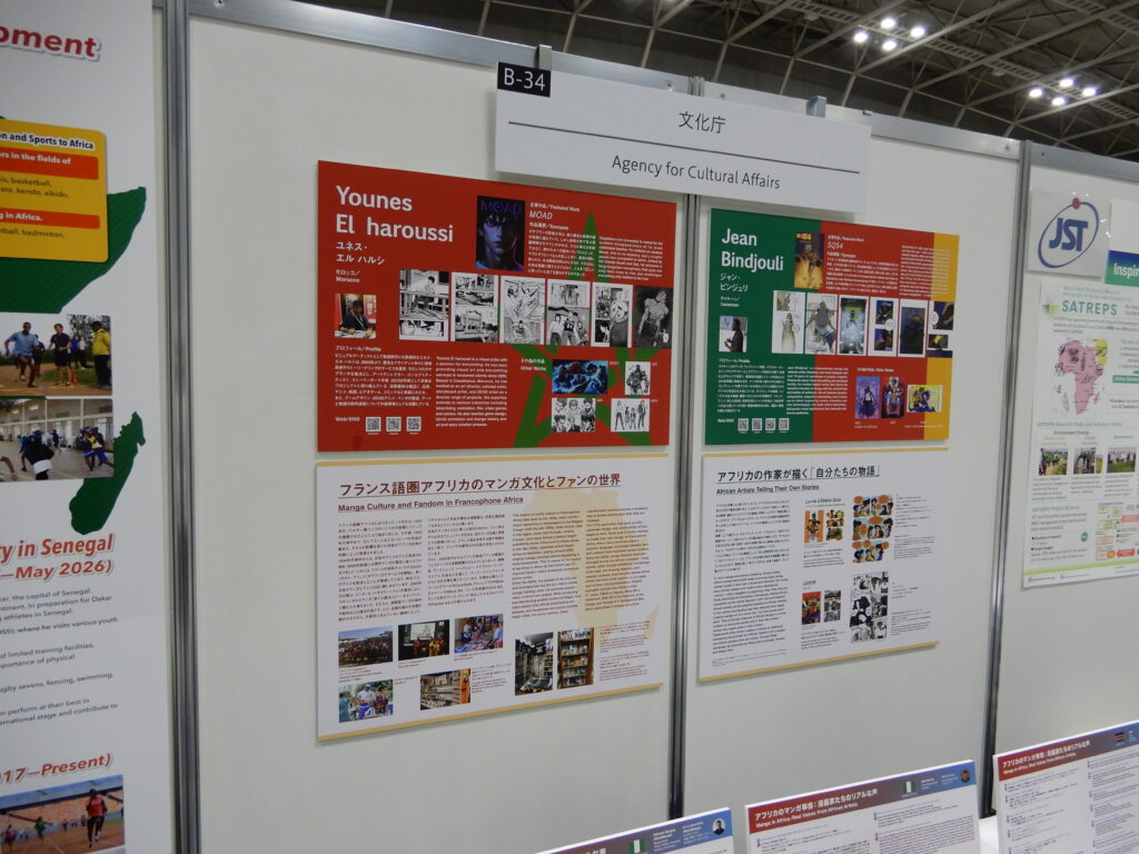 また、会場には展示ブースも設けられ、アフリカのマンガ家や読者層、人気作品などを紹介するパネル展示が行われ、シンポジウムの内容と連動した形で来場者に情報が提供された。